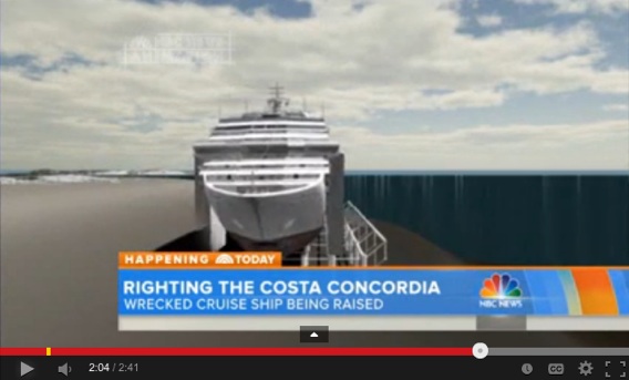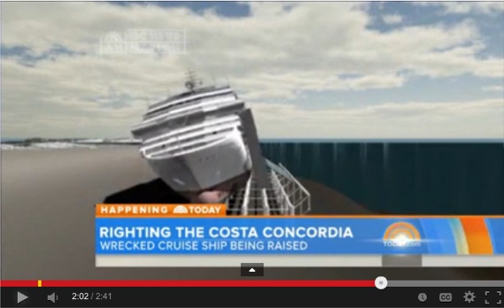 tw Sunday Sep 1 11:10 AMThe Costa Concordia is stuck on rocks. The only reason why it has not slipped into a 200 foot undersea canyon. A major rescue operation has been ongoing for almost two years. This should be months or less from righting and floating the Concordia from its crash site.