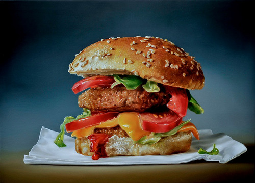 October 21, 2012 - Hyperrealistic Food Every single one of these is a painting, not a photograph, painted in a hyperrealistic style by Tjalf Sparnaay. ZenGum Sunday Oct 21 09:13 PM That is not at all realistic. Your burger never looks like that! footfootfoot Monday Oct 22 08:55 AM Photo Realism is SO 70s. OMG barf. Gag me with a palette knife. Fer Shur. CaliforniaMama Tuesday Oct 23 01:07 PM The Japanese love to show the food they will be serving to you. I love going to Japantown just to look at the food. footfootfoot Wednesday Oct 24 03:44 PM Some of it looks good enough to eat: (@0:44) ZenGum Wednesday Oct 24 06:50 PM CaliMama, in Japan, almost every restaurant has a window display with wax models of their dishes. It makes it much easier for foreigners who can't speak Japanese. Pop out your mobile phone, take a photo of what you want, go inside, show the waitress, and if you're fancy, add "kore o kudasai" - "please give me this". SPUCK Thursday Oct 25 06:31 AM Those all look great but the par-fey(sp) looks... wrong somehow. Like 2d mushed into 3d. Clodfobble Thursday Oct 25 08:37 AM Quote: