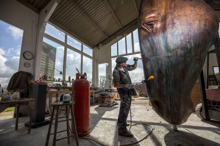 Nic Fiddian-Green, the equestrian sculptor, puts the finishing touches to Serenity, an 18ft copper head, at his studio in Surrey.