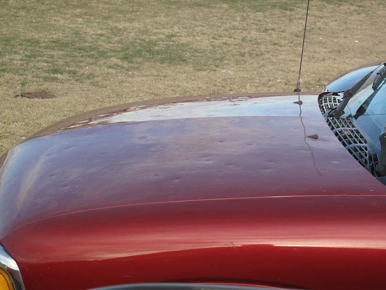 BigV Friday Jun 6 12:06 AMHere's a picture I took while on a trip there in 2013. I saw several cars in the neighborhood that had a peculiar look to them, and when I found this one in the parking lot at the grocery store, I could finally understand what I was seeing. This one's not ruined like the one in xoB's OP, but I reckon each one of these dents came from a hailstone the size of a golfball, give or take. It's probably a new windshield.