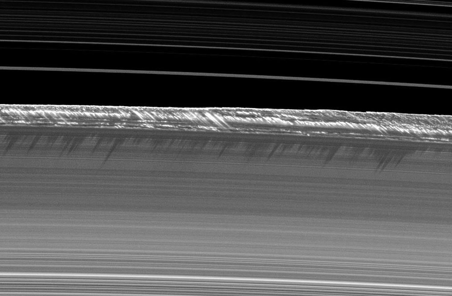 At the edge of one of the rings, there are these structures that tower about 1.5 miles above the plane of the ring, casting long shadows on it.