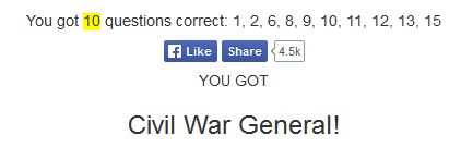 http://www.quizfreak.com/can-you-ans...ns/index1.html Can You Answer These 15 Civil War Trivia Questions? You got 15 questions correct: 1, 2, 3, 4, 5, 6, 7, 8, 9, 10, 11, 12, 13, 14, 15 YOU GOT Civil War General! |