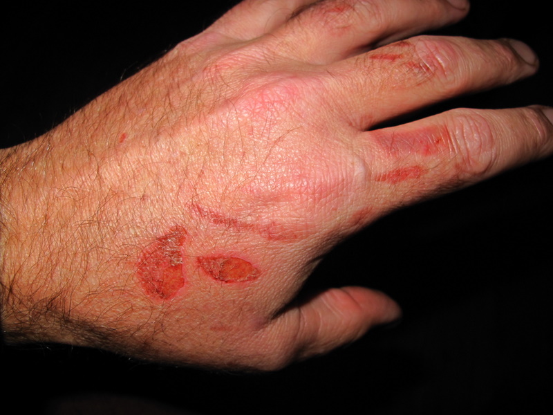 I burned myself last week. Fucking carelessness on my part, was cooking and splashed some hot oil out of the pan, onto my hand and onto my bare foot. fucking ouch. First pair was the night of the crime (friday), second pair is rfn. My hand's feeling ok. The thin skin over the burn was chafed off by my gloves during the hike. My foot came through the hike fine, but I recently lost the skin over that burn too. It hurts and my foot's swelling. I just want it to dry out and skin over, but that's not happening very fast. Upsetting and painful.