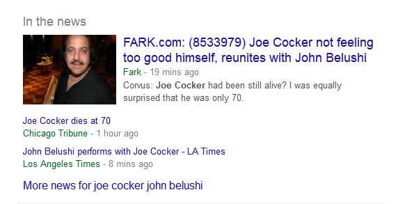 Nothing wrong w/the headline itself (outside of bad taste)...but, that pic is not Joe Cocker, nor is it John Belushi. That's porn legend Ron Jeremy. Who is alive, btw. :right: |
