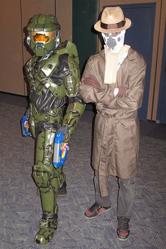 SonofV chose Rorschach from Watchmen. Strictly speaking Watchmen isn't an anime, but who's counting? He drew inspiration from a variety of sources in the years to come, and he had a lot of company in that approach. Not sure who the cutie in yellow is, but the green guy is almost certainly from Halo, a video game, a rich source of ideas to come. You'll see him again. Attachment 60229 Attachment 60230 I chose a YouTube video called In Memory of Soldier A as my inspiration. Soldier A looks good fresh from central casting next to Jet Black, circa 2010. Attachment 60231 My favorite part was the big yellow arrow I made that followed me around (being stuck down my shirt). I was easy to find in a crowd. Attachment 60232 |
