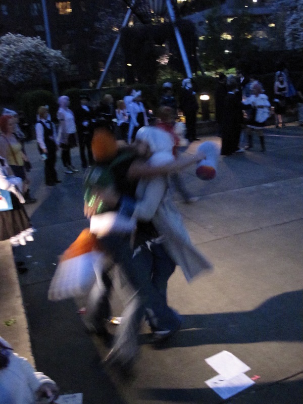 This was the first time my costume changed over the three day convention, just as that poor bastard in the video shows his wear. Attachment 60233 Glomping works a little like mass spin-the-bottle. Where your bottle points, you walk until you reach someone on the outer ring, hug each other, and trade places. They go to the center and find a bottle and you wait on the outside to get pointed at and hugged. This game is a lot of fun, and SonofV played it until they closed due to darkness and attrition (about midnight). Attachment 60234 Attachment 60235 Another fun game is Cosplay Chess. On the left is black with a couple of Team Rocket pawns nearest the camera. The other characters are also well chosen re: good vs evil. When they come into the same square, they battle. I didn't get up to speed on all the rules, it was a little overwhelming. Attachment 60236 |