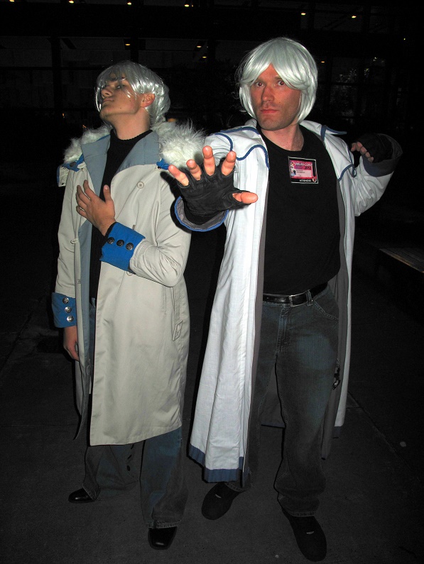 Lelouch Lamperouge from Code Geass was the subject of his second SakuraCon. Here's a nice glamour shot we used a reference making his costume. Attachment 60217 I chose Jet from Cowboy Bebop. Many images are available, this is a good start. I dyed my hair and beard and then shaved the top of my head to resemble my tonsured muse. Attachment 60218 SonofV as Zero Attachment 60219 Me as Jet with some of SonofV's school friends. Attachment 60220 |
