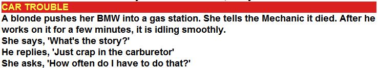 Late at night this guy runs into a pub and gets a glass of water from the bartender. The guy drinks it in one gulp then asks for a second glass. Six glasses later, he has recovered enough to speak. "Thanks," he croaks. "That’s one hell of a thirst you’ve got," says the bartender, The guy says, "Any man would be as bad if they’d just had sex with the woman in my car. She’s insatiable. She wants me to go right back out there and do it all again, but I can’t." ‘Where’s your car?" the bartender asks. "At the roadside," the guy gasps. "Tell you what," says the bartender, "you watch the bar for me while I go out and take your place." "Be my guest, the broad’s a nymph. She’ll do anybody." So the bartender goes outside and gets in the car. It’s totally dark, so the woman doesn’t realise she’s with a different man. They get right down to it, humping away. Five minutes later there’s a knock on the window. It’s a cop and he shines his flashlight on the naked couple. "What’s going on here?" he asks. "It’s all right, officer," explains the bartender. "She’s my wife." "Oh, sorry sir, I didn’t realise...""Neither did I till you switched on that damned light."