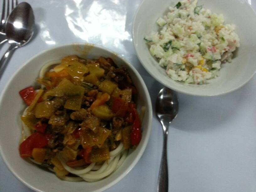 Yesterday's dinner at the holiday camp was noodles and meat with peppers and tomatoes. You begin to see a theme here? With "crab salad" probably containing the ubiquitous evil crab sticks. However there was very little in evidence and I suspect it was mostly rice, boiled egg and cucumber from the previous day. And why not?