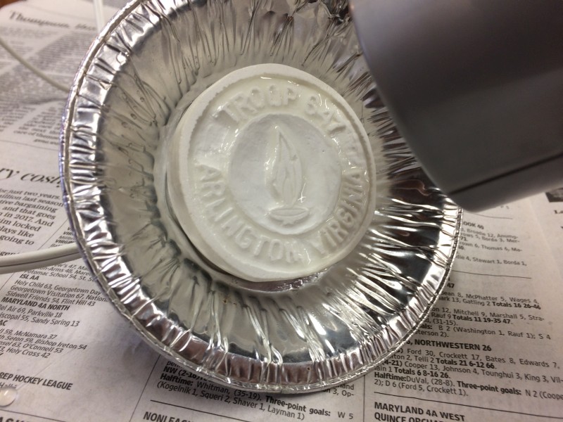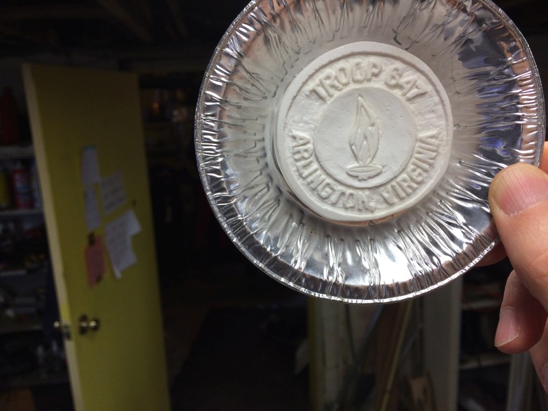 All that mixing had introduced bubbles, so we had to tap the molds for a few minutes to encourage the bubbles to rise away from our precious plaster emblems and pop at the surface.