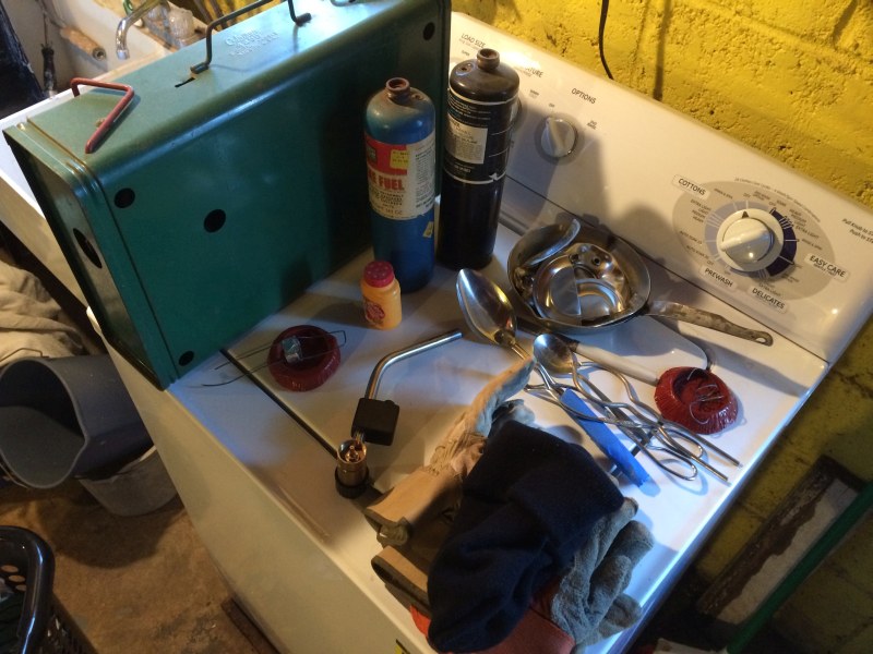 Attachment 59550 I snagged some pewter knicknacks from my cousin's house. They may be a higher quality alloy since they have an actual hallmark on the bottom. Attachment 59551 This is gathering almost everything together before heading outside to melt. Missing are a cookie sheet and wire rack I made out of hardware cloth. Attachment 59552 I have the cookie sheet here to diffuse the radiant heat from the burners and the wire rack I made to lift the rubber molds off the cookie sheet. I want them to be heated evenly, like an oven would. Attachment 59553 |