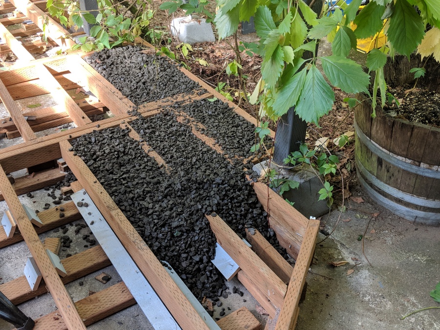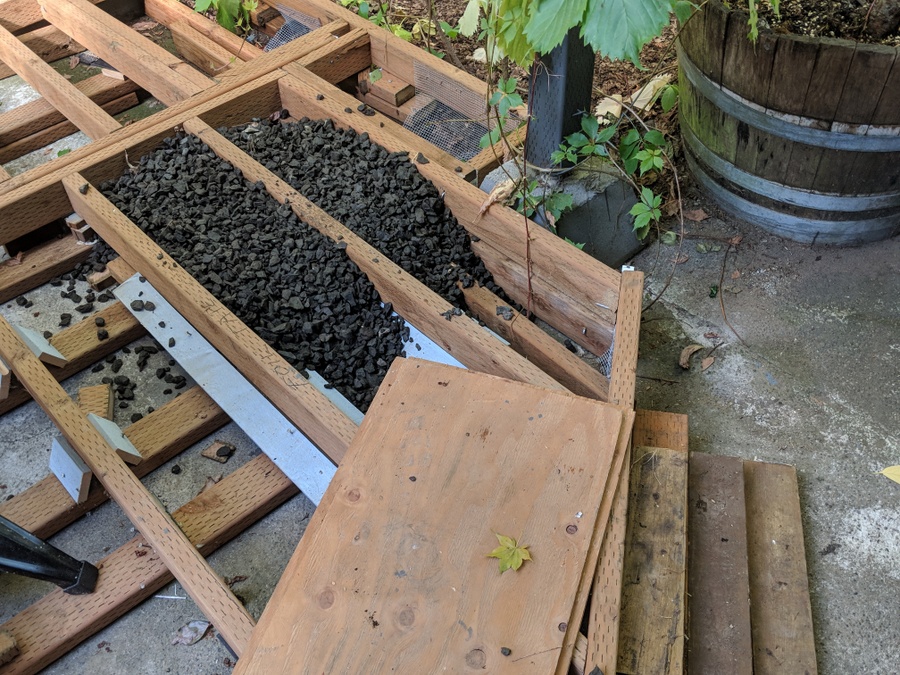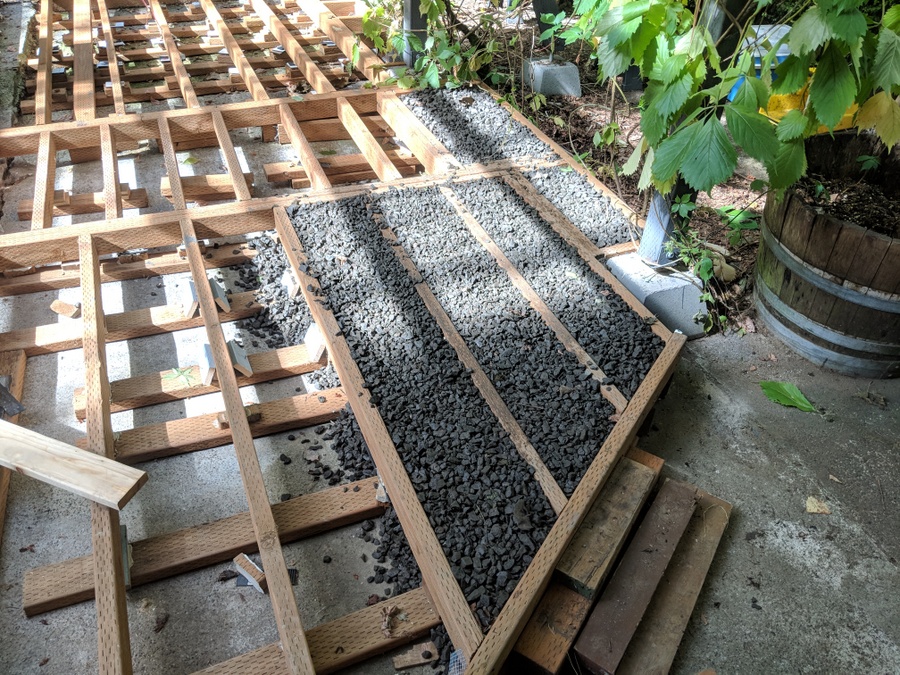 In other news... I filled a few of the bays in deck framing this weekend and I *love it *. It is absolutely solid. Bombproof. The screens at the bottom do their job perfectly,.... Where I put them in, that is. I found one small spot, a inch across or less that I'd overlooked. Sure enough, gravel was leaking out. It'll work out OK though. I managed to unload about 3/4 of the truck before I had a little accident with the wheelbarrow. I had a heavy full load and I crashed it, broke the handle, went ass over teakettlle into the grill and hurt my hands. I hyper extended my thumb enough to bruise my palm. Hurts like a bastard. Pics later. I have a replacement handle set and hardware in the car and once I have the wheelbarrow repaired, I'll be able to unload a truckload in one night. |