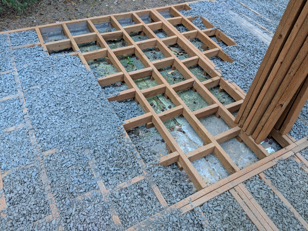 And here's a post with a better view of the step in front of the door to the house. It's a chunk that's almost level with the threshold of the door to the house. At the very beginning of this project, I thought about taking out all the concrete, digging down, laying some gravel and making room for piers and posts and beams like you describe. Then the prospect of taking out all that concrete made me achy and tired. Noooope. Plan B was born, and you're lookin at it.