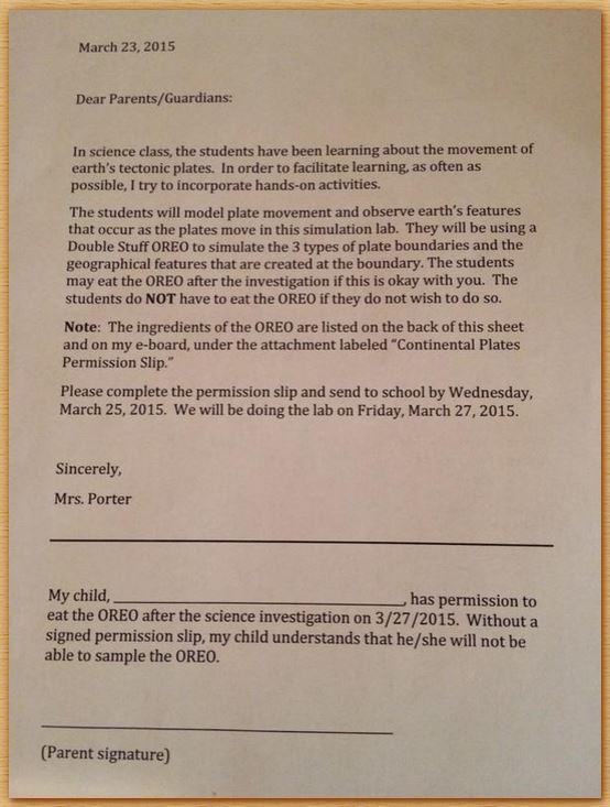 Using an Oreo to demonstrate plate tectonics is not a bribe. It's a good model that kids at many levels can understand. If as you say, it also happens to be fun, what's wrong with that ? And the permission slip just shows the teacher was thinking ahead about what might happen to the cookies during/after the demonstration. I thought it was an innovative, inexpensive, and readily available prop by a conscientious (and maybe well-experienced !) teacher. |