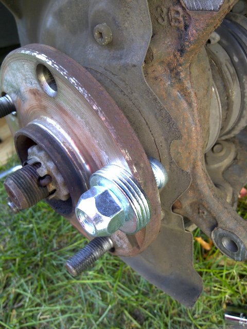 I stacked a bunch of oversized washers and put one of the new lug nut on backwards so the flat part of the lug nut would rub against the washers. This worked great at first, but when I started to apply actual force to the wrench, the whole wheel hub started to rotate. Attachment 41197 So I got a long pry bar and slipped it between two wheel stud bolts and against the ground. That locked the wheel hub in place so I could apply some force and pull that new wheel stud bolt into place. It worked beautifully. Attachment 41198 Here's the first new stud snug in the hole! The second one was even easier because I knew the routine now. Attachment 41199 And I cleaned and sanded the brake rotor a little to get rid of some of the glazing on the surface. There were no deep ridges at all, so I could reuse it without resurfacing it. Attachment 41200 Oh, hey. This is a good picture where you can see the piston in the background. It's that silvery looking cup with the rubber gasket surrounding it. It's sticking out pretty far. As the old pads had worn down, it pushed out farther and farther. I'll need to compress it to make room for the new thicker pads to be installed. |