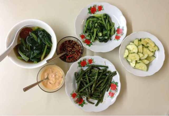 Today is vegetarian day so we has spinach soup, spinach stir fry, green bean stir fry, and cucumber. The sauces are spicy bean curd sauce and spicy soy sauce. Afterwards, we had Japanese green tea and chocolates.