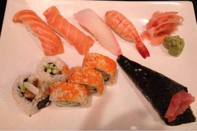 Since Bruce asked about sushi portions. I went to a sushi place the other day. I shared a bento box and a sushi roll with my sister but forgot to take a picture. However, I took a snapshot of someone else's, hihi. (My plate had 8 sushi.)