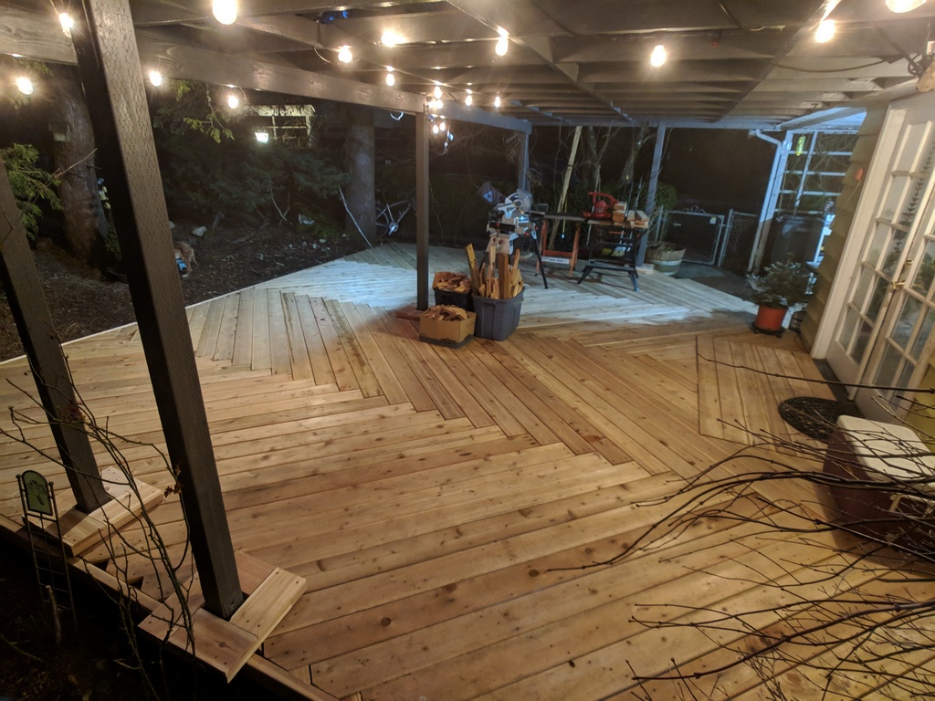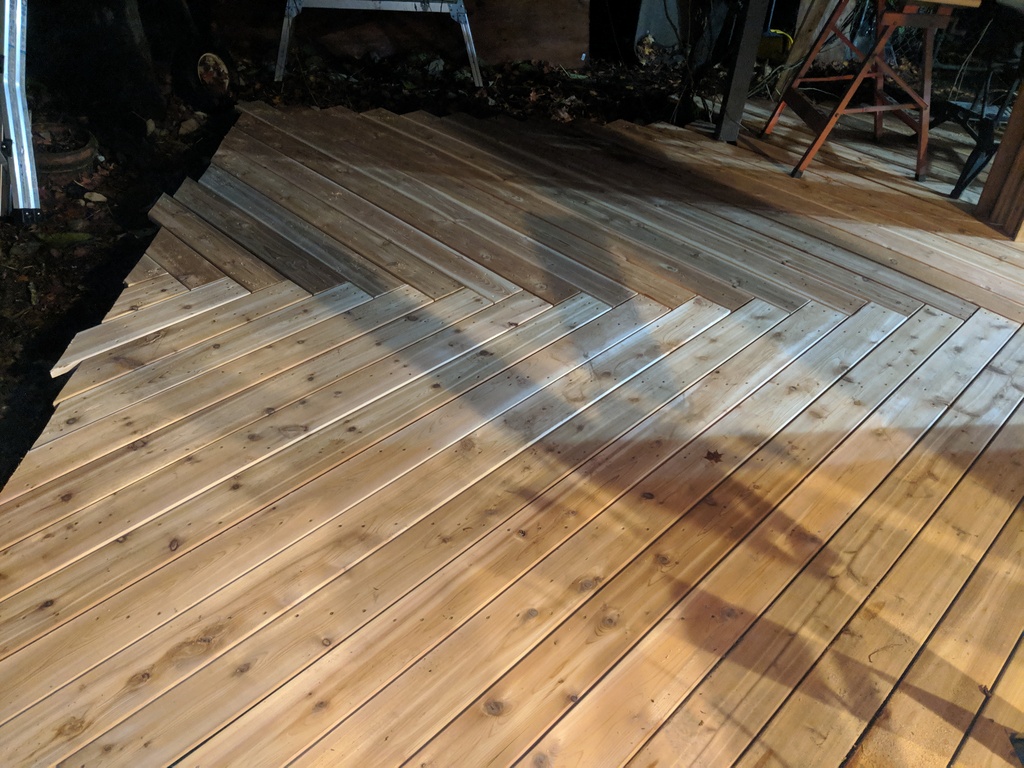 Attachment 67506 Trimming up the ends left some offcuts, some of which got recycled in places where only a short deck piece was needed, like the center of this V as I approached the edge of the deck. Attachment 67507 Attachment 67508 Attachment 67509 |
