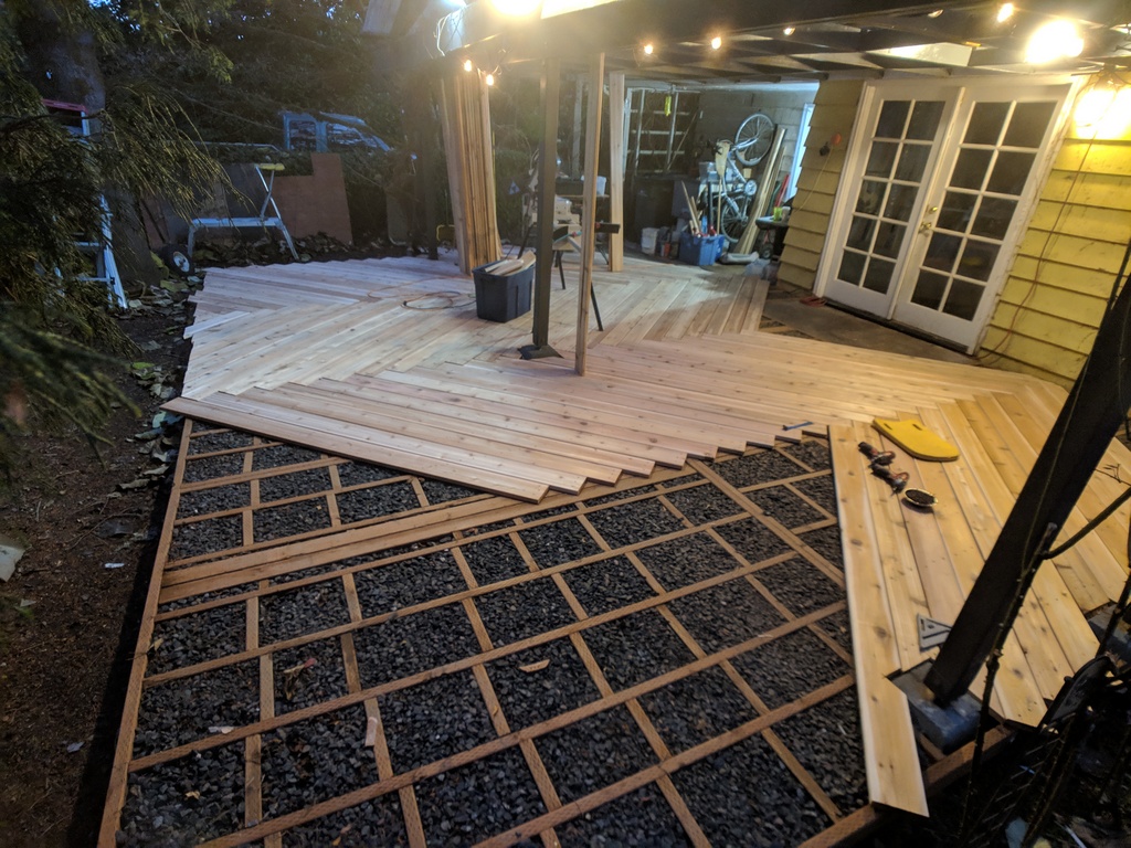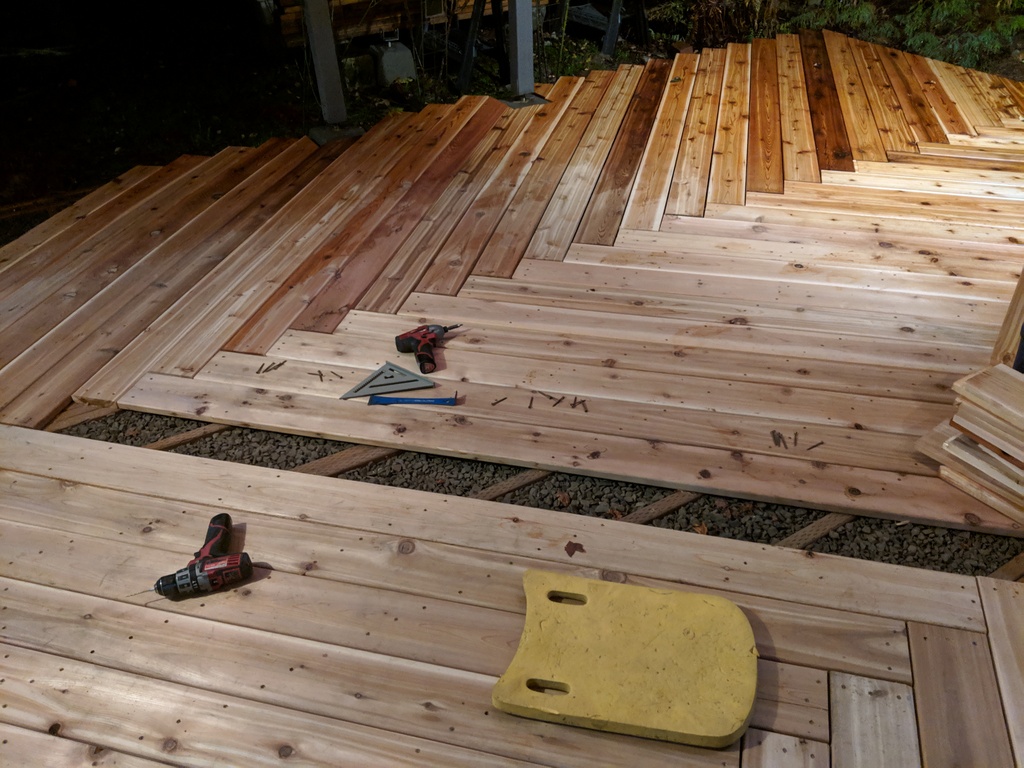 Now that I have a level, flat, solid surface upon which the deck boards can be affixed, let's get started. I knew I wanted cedar as the deck material. I love cedar. It's a dream to work with. Straight grained, easy to cut, rot resistant, fragrant, lovely grain patterns... yeah, I'm a fan. There are plenty of dimensions to choose from, we picked 5/4 x 6, mostly 8 footers. Back at the beginning of this process we saw the old deck had 2x4 material as the deck material. Super strong, but needed to not deflect across the very wide spans of the sleepers they laid as a "frame". This frame is a lot more substantial and has much shorter spans so a thinner deck board is sufficient. Now that I've been able to walk on it I can say it's solid--no deflection.