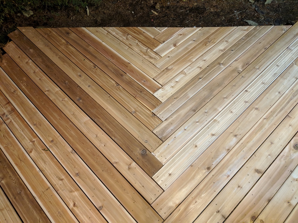 I wanted to have a different design from the standard straight boards, laid out straight--boring. Also, I knew there would be seams since getting boards that were long enough to span the whole deck, even across the short axis would be extra expensive. I have more time than money (boy does that come into play a lot...) so doing something beautiful and interesting with the shorter, less expensive material was the option I chose. There are a lot of stunning deck designs out there. I spent a lot of time looking at pictures of different decks and this basic design caught my eye, basketweave. There are a number of advantages to this design. Minimal cuts, no miter cuts (though I did have to trim the ends at 45 degrees where the board extended beyond the edge of the deck), unusual, makes efficient use of 8 foot boards, plus I like it. Here we go. I tested the pattern with a few fence boards and 2x6x12s I had laying around. Gorgeous, as you can see. This is the center of the deck, right in front of the doors. I like the image of having the arrow the boards create draw you out onto the deck and into the yard. Attachment 67423 Attachment 67424 Attachment 67425 Attachment 67426 |