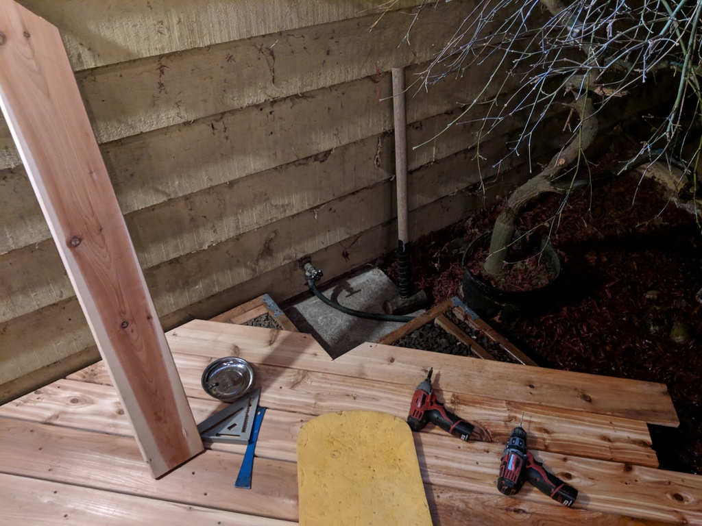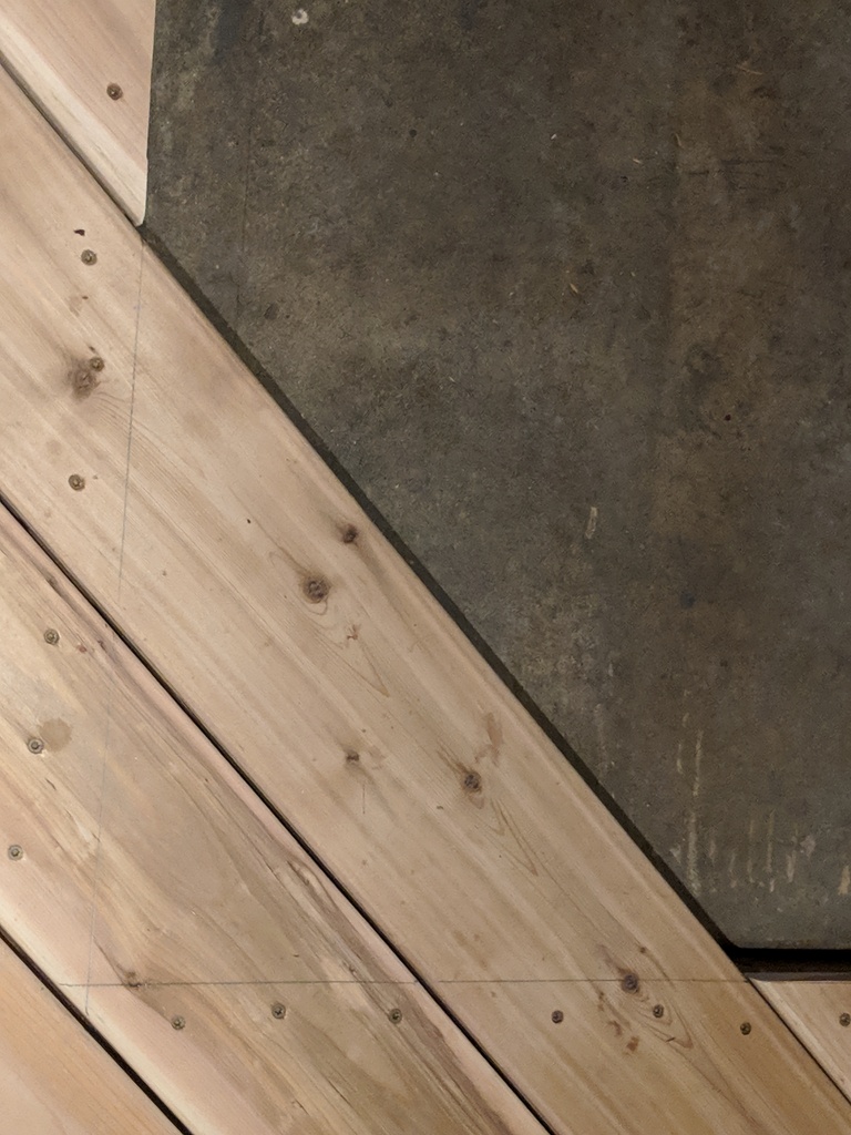 This section in front of the doors didn't get the same framing treatment because the concrete "stoop" is in the way. I have a plan for a "door mat", but I need to square up this space first. Some boards had to be cut at an angle then installed.