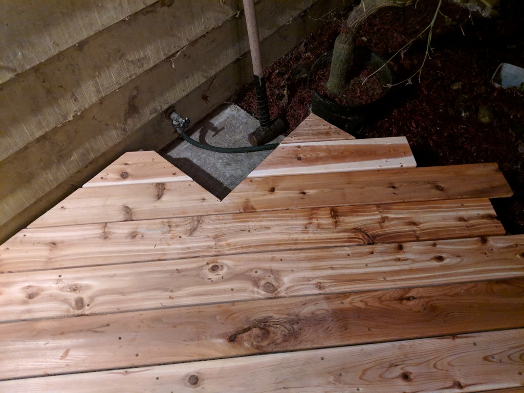 Next is the "door mat". This section is where a concrete stoop is *just* barely below the threshold of the door. My "deck" here is very, very thin. Two layers perpendicular to each other will make cover this area. I'm using fence boards here, 7/16" thick, twice. It gives me the chance to provide a little variety and I'll be able flip this over to spread out the wear pattern.