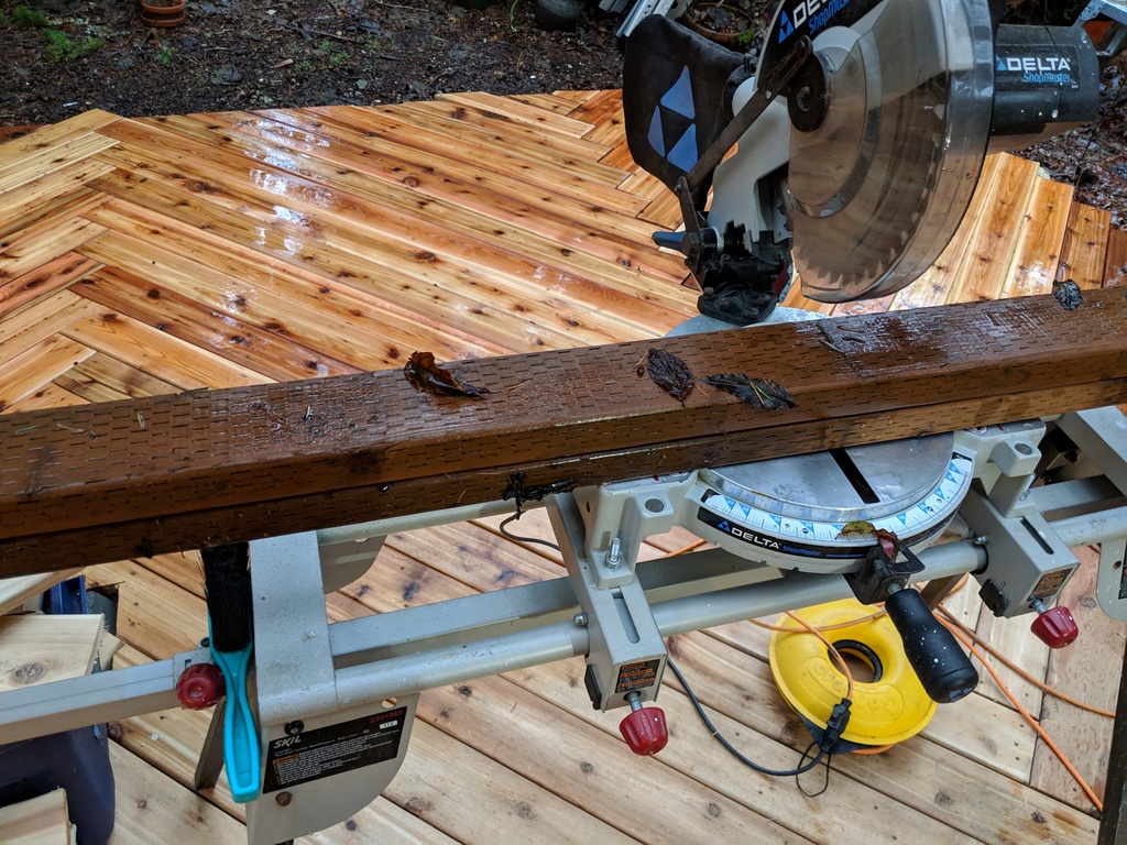 In the previous flush trimming pictures, you might notice that my right handed saw was pushing the cut to upwards or to the right.. this is fine, except my next cuts were "behind me". And I had that damn post to deal with, the notch for which you can see in the last pic. So I gave up and moved back across the deck and started there. Now my cuts and my saw guides were moving in the same direction.