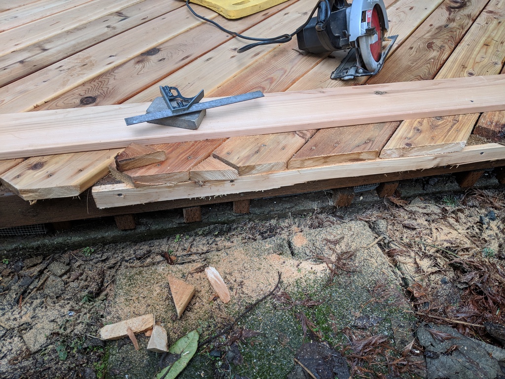 The corner of the deck where I had to make a number of long angled pieces, that area needs a step. I'm making a simple platform that will be topped with deck boards. The frame will be made from the same pressure treated 2x4s the deck frame was assembled from. Here I'm lining up the cut for the two longest pieces.