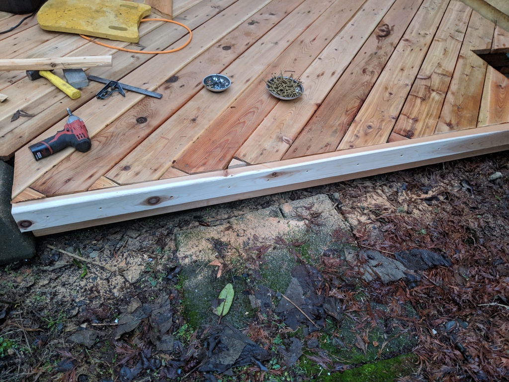 Attachment 67518 Attachment 67519 Third picture shows the 2x4 (cedar) in place, as does the fourth picture with "skirt" underneath (applied before the 2x4 frame piece.) The 2x4 is the strong piece to catch the impact of people's foot strike against the edge of the deck. The "skirt", really just a 2x6 cedar fence board, extends down far enough to trap the supporting blocks that hold up the frame on the outermost edges. Attachment 67520 Attachment 67521 |