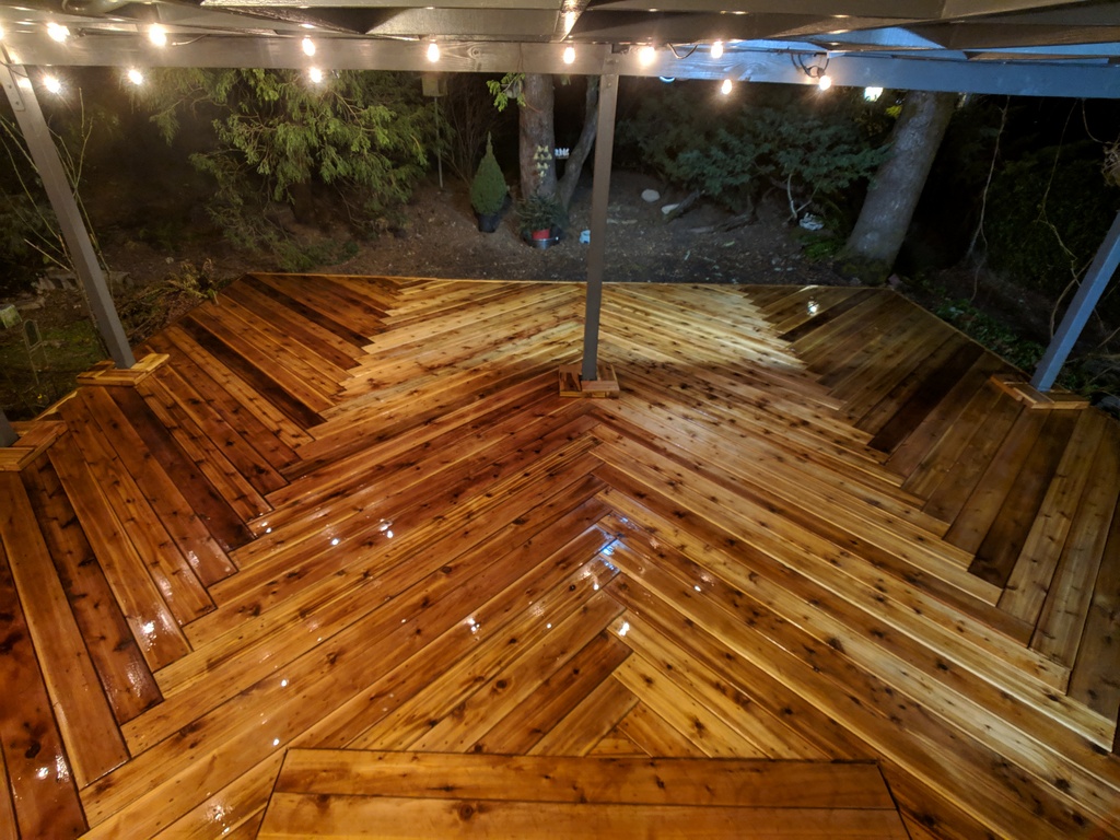 Look how fine and straight grained this wood is. This is one of the 2x4s I used as a wraparound frame. After the lower part where the frame was concealed, I added a cedar 2x4 flush with the top of the deck and against the edges of the deck boards, shown here on the north side, west side (pre-installation), and south side.