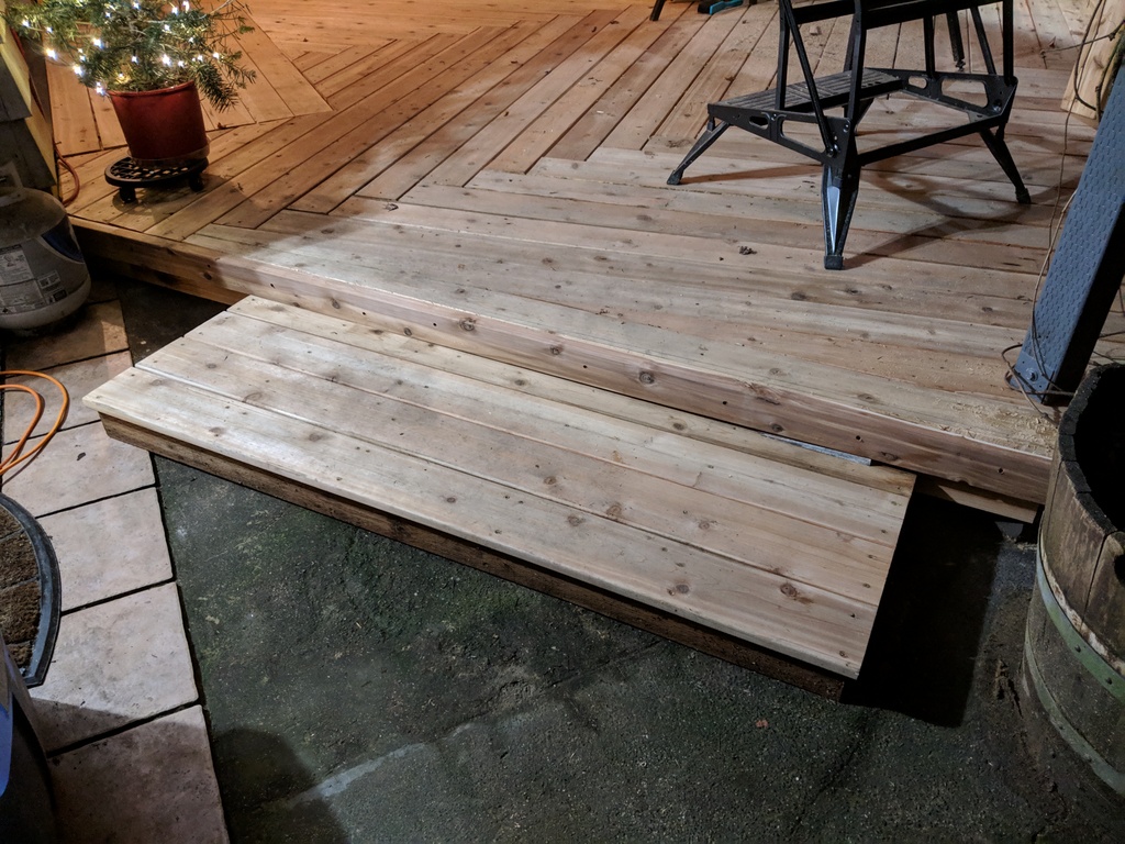 This little two step construction is for sale at the hot tub store. $499.00 No, not made of SOLID GOLD, just that pvc fakey lumber. The color is about perfect, but we declined. That's... maybe $20 of 2x4s and some hunks of leftover deckboards. The remaining 479 dollars will buy a lot of champagne.