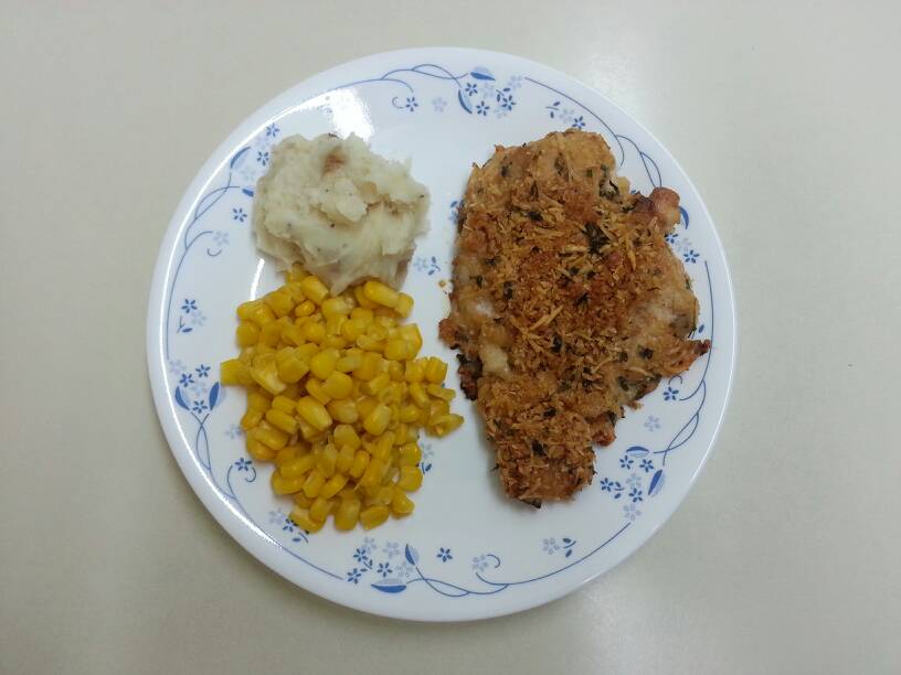 ranch parmesan crusted chicken with mash potatoes and corn