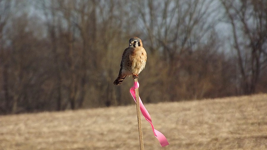 Attachment 47146 Meh, turkeys. Aaand then, as I was about to pull away, I looked about 50 feet in front of the Jeep, and sitting there on a survey stake, was this fella: Attachment 47147 Attachment 47148 I guess he had been sitting there when I pulled up, and, just didn't see a reason to leave. I almost didn't see him, wouldn't have, if it hadn't been for the fluttering survey tape. That, friends and neighbors, is ye olde American Kestrel, which, Wikipedia tells me, is not a 'true' kestrel. Whatever, it's a kind of falcon, and, I find that cool as hell, as I've never laid my personal eyes on a falcon, or a kestrel, for that matter. I believe this one is probably a juvenile. |