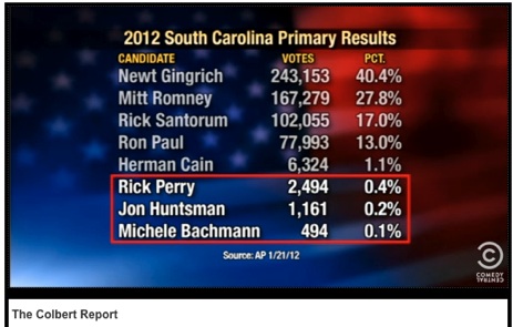 ... but too many people just sat on their butts under the palmettos. :eyebrow: A video clip of Colbert's announcement is embedded in the link below MSNBC 1/23/12 Colbert suspends Cain campaign, but Stewart keeps the Super PAC Quote: