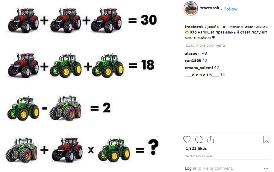 I want to see one with dwellar heads instead of tractors. And different math, without the order of operations quiz in the final line. And I want exponents. |
