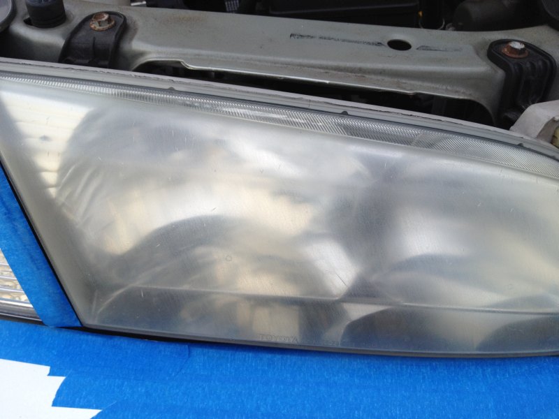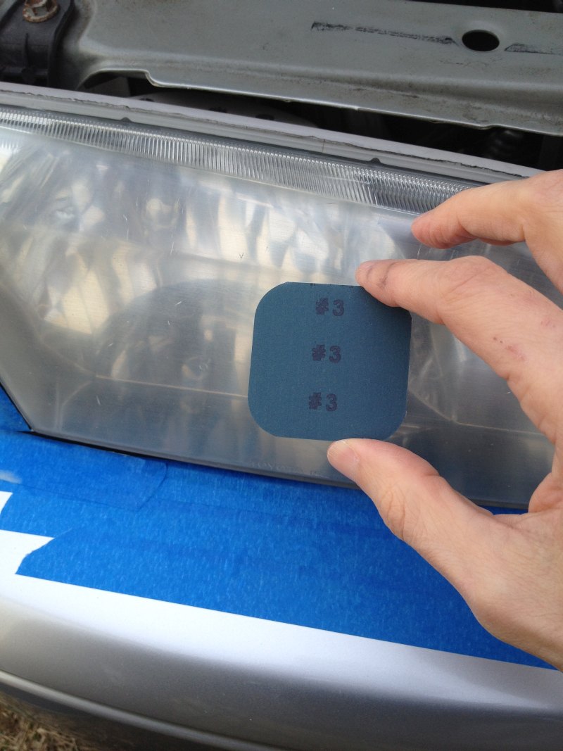 Before: The headlight has been cleaned and dried and masking tape to protect the surrounding area. Attachment 47098 Now I'm sanding it with the coarsest of 4 sanding pads. The one marked #1 on its face. The kit provides a spray bottle of soapy water for wet sanding. Attachment 47099 I dried it off and you can see how super scratched that first grit of sandpaper made it. Attachment 47100 So then I sand in the other direction with number 2, and it's already looking a bit better. Attachment 47101 On to number three and then four, always sanding perpendicular to the last time to get rid of the scratches left by the earlier grit. And then after you go through all four grits, you switch to the abrasive polishing compound. |