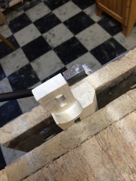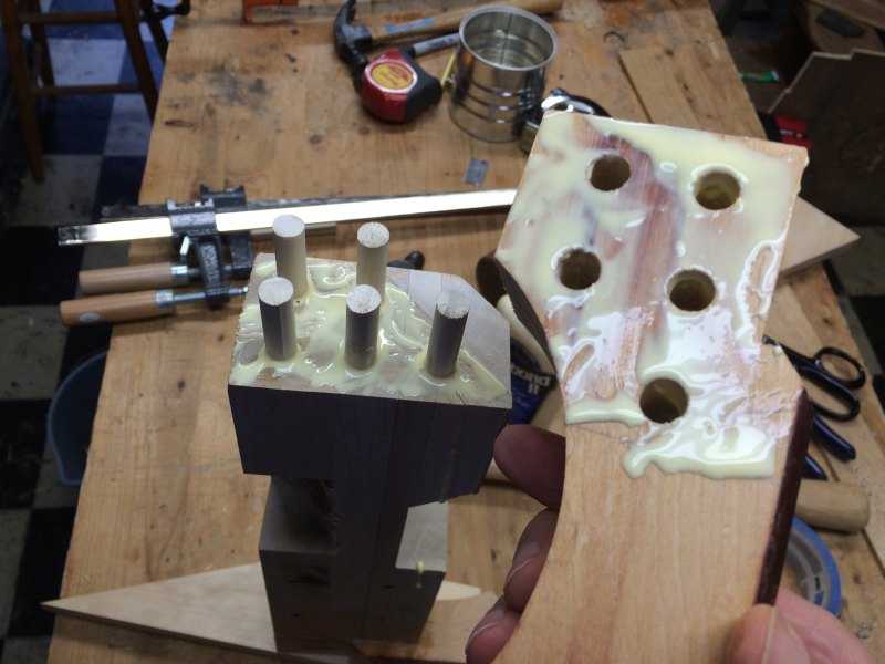 I turn my attention back to the table support stuff. I need to glue the trunnion supports to the end of the long block. They will be held in place with these dowels and glue.