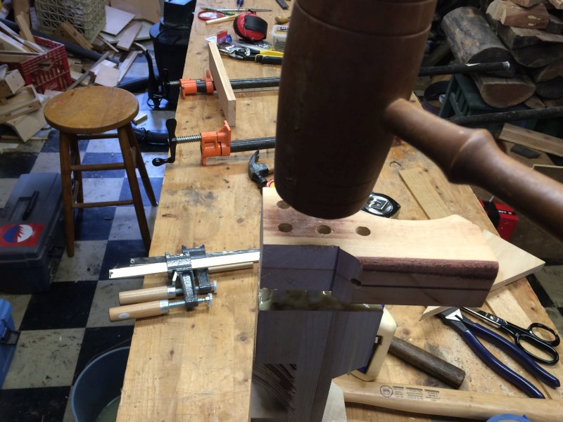Attachment 57830 It's a difficult fit. It needs a little persuasion with a mallet. Attachment 57831 Still can't get the pieces tight against one another, and it turns out I made my dowels too long. I can't pull them together with a clamp because the dowels are in the way. So while the glue is drying, I frantically drill out some oversized holes in a clamping block that will fit over those dowels that are sticking out. Then I can clamp them together. Glue-ups can be stressful some times. Attachment 57832 But it all comes out nicely, and I bolt the whole thing down on the table. Attachment 57833 |