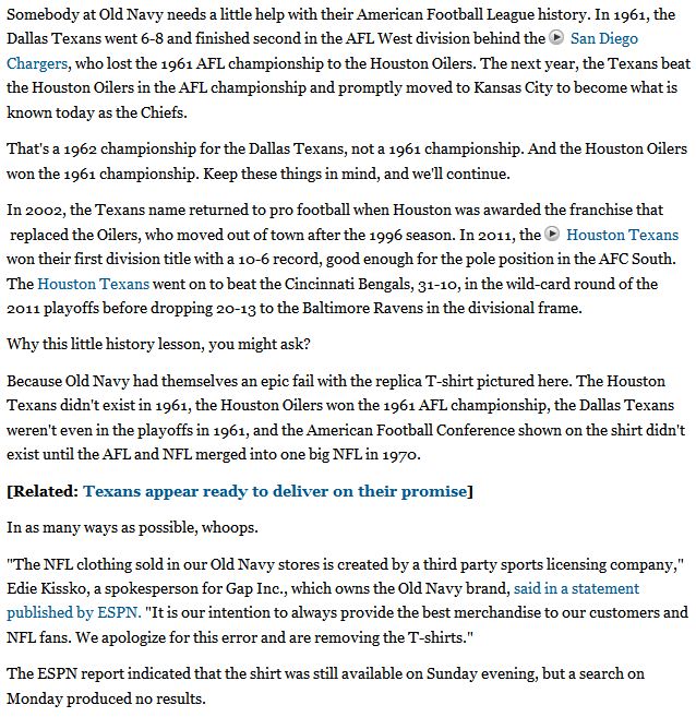 It's funny, because I don't know shit about football but I always remember that 2002 is when the Houston Texans came into existence. Because we were in final beta for Quarterback Challenge 2003, and the designers were shoving the brand new team data into the game at the last possible nanosecond. Except we'd already done the audio with the professional sports announcers months ago, and there was no way we could afford to get them back for another session. But I did have approximately 16,000 files of source material. So I went through and pulled the audio file for every Hugh, Hubert, humongous, and humor; and every Johnston, Royston, Livingston, and Penistone; and every Tex syllable; and every "unz;" and spent all night Frankensteining various combinations together into appropriate inflections for every team name stitch in the game. Ironically, the dude actually said the words "Houston" and "Texans," in an unlockable interview clip talking about how he remembered something not-at-all-interesting about the Dallas Texans in the 1960s. But he slurred his speech and it was unusable.