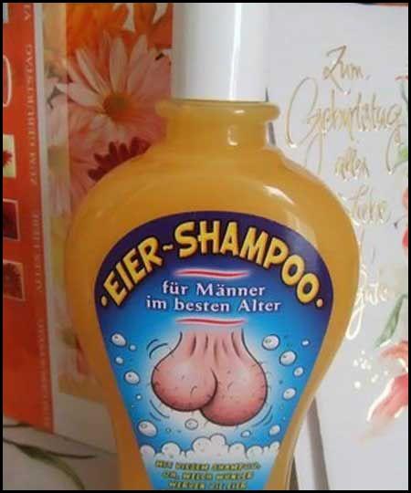 I would have guessed the translation was "Nutsack shampoo. For man's best friends." |