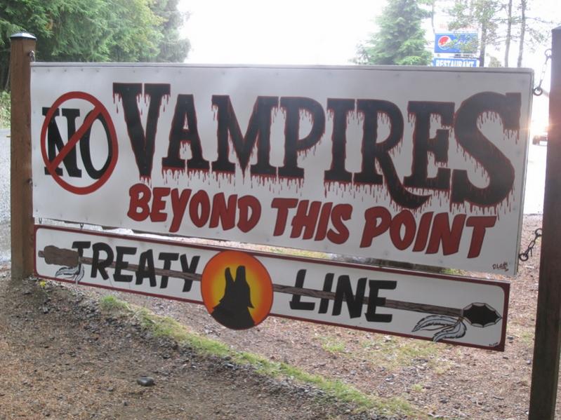 Attachment 40353 It's where the stories from the Twilight franchise were set. And some people in Forks take FULL advantage of these rabid fans. Attachment 40354 This was scary, especially so close to Vampire Territory. Attachment 40355 Even the restaurant at the Three Rivers Resort gets into the game. Attachment 40356 Not shown were pictures of girls, they were always girls, standing in front of road signs, street signs, restaurant signs, snapping pictures "I was *there*!" I bet the Twilight Tours minibus makes numerous stops at such photo ops. |