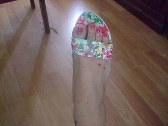 I hadn't worn them for months (had no nail varnish to put on my trotters back then) so my feet went into alien attack mode and I came home with two bleeding blisters. Ridiculously soft feet, which is why I deliberately let them harden underneath - I get blisters on the soles of my feet when trying to break in heels you know. Sigh. |
