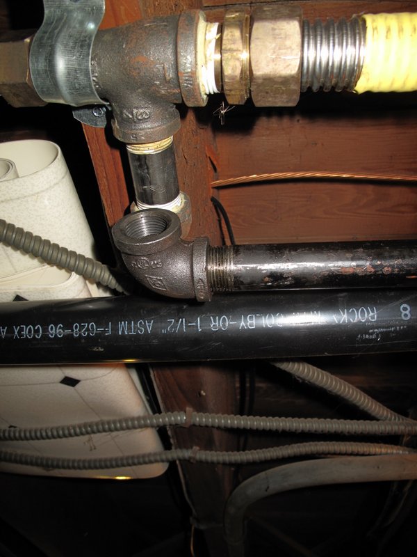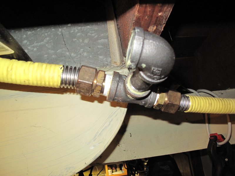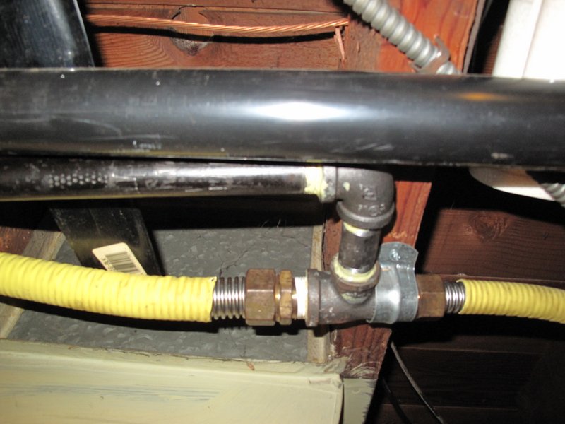 Attachment 40916 This is the wall behind the space where the stove/oven lives. As you can see, the old electric stove 220V outlet is there, as well as a register for the furnace. This particular duct is amputated and non-functional. Conspicuous by its absence is a gas line. Not for long! Attachment 40917 Welcome to my basement, please overlook the mess. The yellow line is my gas line. The yellow line is CSST, corrugated stainless steel, a flexible (slightly so, a bend radius of approximately 18 inches. Not exactly supple, except when compared to black iron pipe.) On the left is a 1 inch line, then a iron tee/reducer 1"-3/4", then off to the right is a 3/4" line that runs all the way to the dryer. This line runs parallel to the wall you saw in the previous picture and somewhat "behind it". Attachment 40918 Here I've rotated 180 degrees and am looking up at the bottom of the floor shown in the first picture. On the left you see a gray curved conduit, that's the conduit that carries teh 220V electrical for the stove. a little to the right is the underside of the furnace duct/register. You can see the amputation at the upper right of this picture. Also prominent in this picture and the previous one is the black pvc pipe. That is my kitchen sink/dishwasher drain. I installed this new run a few years ago (a different DIY story). The spiral half-inch conduit is armored conduit for my electical runs. Inside those conduits are cloth covered electrical circuits. The white painted valve and the copper lines are the remnants of the relocation of the electric water heater and its replacement with a gas fired unit. Attachment 40919 Are you oriented now? The tee points in the direction parallel to the joists, and is located a couple of feet to the left of the previous camera position and slightly behind it. |