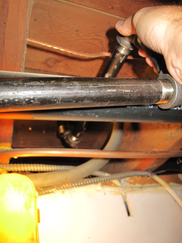 Then the elbow, then the long pipe. Attachment 40937 Then, trouble. Instruction number three reads "Tighten pipe to ANSI standards." Yeah, right. Who knows what that means. As I got the long pipe on, it acted as a long lever and gravity loosened the tee/nipple/elbow connection. Now this was my second biggest worry abou this installation. I'd feared that the install would require me to turn an elbow to a specific direction and tightness, but that those two qualities would not both be acceptable at the same time. In this case, I turned the elbow until it was (kinda) tight, not over tight, but so it was pointing in the right direction. I then found out that THAT particular rotation was not tight enough. Attachment 40938 So, it had to be taken apart and turned another 300 degrees to make it line up properly again and be another turn *tighter*. Attachment 40939 I put the bracket back on so I could put some real torque on the long pipe. |