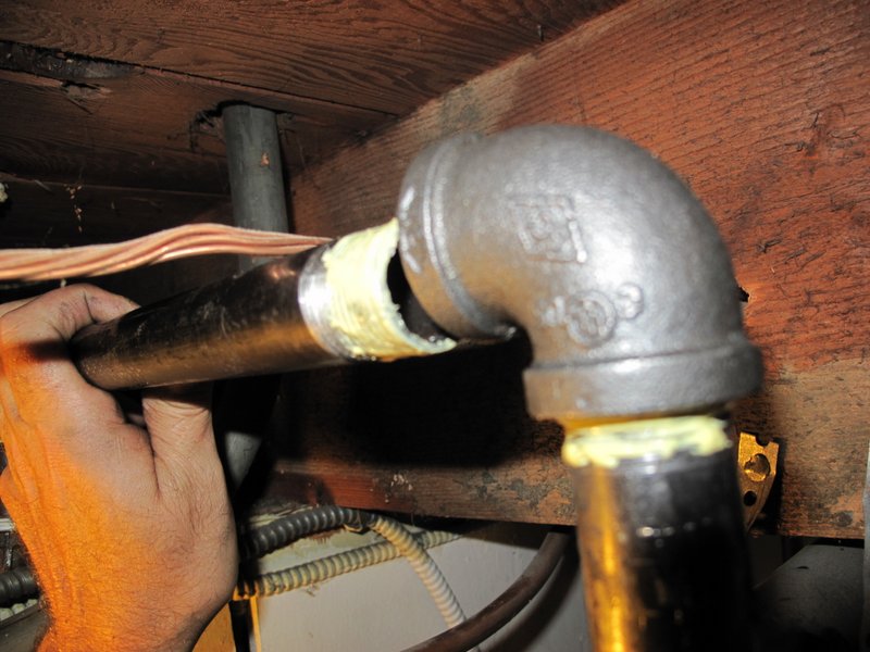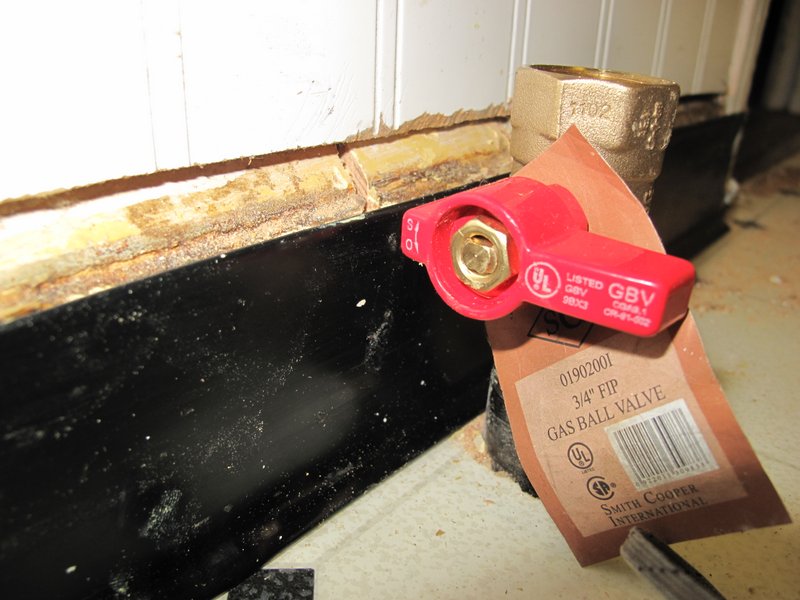 But I was able to line them up, get them started, (then I took a break), and then tighten it up as tightly as I could manage. Attachment 40966 LOOK! There's my gas stub! Only one piece left! Attachment 40967 So, I put the joint compound on the male threads, carefully started the brass valve body on the iron pipe and discovered that the valve handle fouled against the wall. |