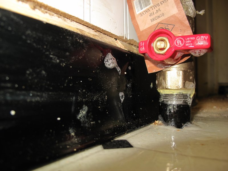 Attachment 40973 The testing process calls for COMPLETELY ASSEMBLING your pipe system, then turning on the gas (!!!) then soaping up all the joints and looking for bubbles. I soaped all the joints. Attachment 40974 Including the one in the kitchen. No bubbles anywhere!!! |