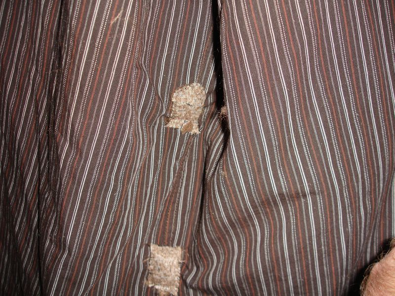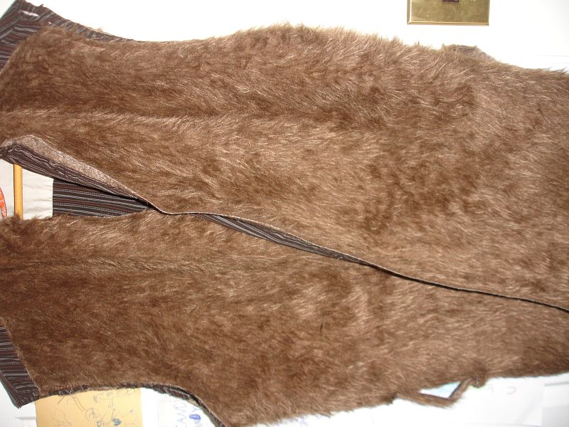 Attachment 41265 and finished: Attachment 41266 now the vest. I bought a brown dress shirt one size too small at goodwill for $3.50. cut the sleeves and collar off, Attachment 41267 ...and laid it on my 'fur' to cut the shape. Attachment 41268 I got the fur at JoAnn fabric for $20. |