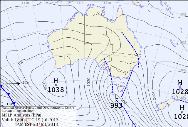 Attachment 44855 There is a low near Tasmania, and a high south of Perth. Remember that in the southern hemisphere, winds go clockwise around a low and anticlockwise around a high. As a result, a big pool of very cold moist air is being swept up from the Southern Ocean and blasted over Southern Australia. So we're having a top of 11 degrees centigrade, showers, small hail, and a chance of snow in the Mt Lofty ranges near the city. Although right now it is sunny outside. |