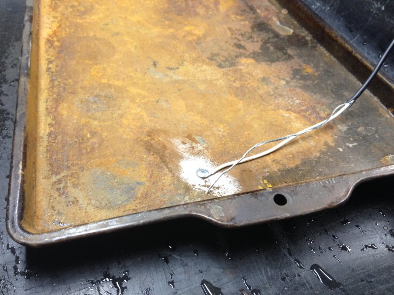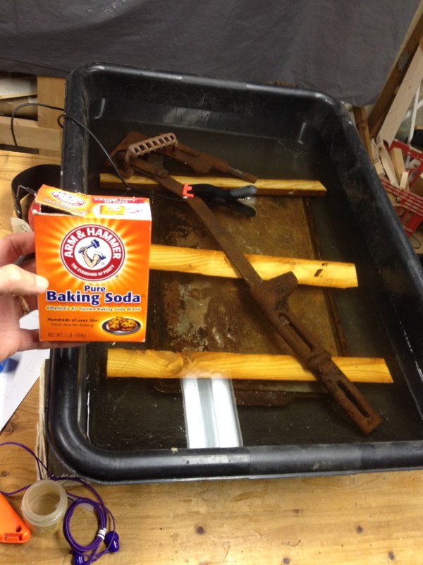 The cookie sheet was in a big plastic pan, and I covered that with three strips of wood, because for the electrolysis to work, the tool can't touch the sacrificial metal, otherwise the electric current will just go metal to metal instead of through the solution. I poured five gallons of water over the tool, and added 5 tablespoons of baking soda to act as an electrolyte. Most instructions on the web say to use washing soda, but baking soda works just as well and is something I had on hand. I had clamped the negative wire to the tool so there was a good electrical connection. When I plugged the laptop charger in. the water started looking a little cloudy around the tool near the wire. Attachment 48172 After a couple minutes bubbles started appearing. After 30 minutes there was a rusty scum forming on top. Attachment 48173 And after a couple hours, the rusty scum was really thick. Now you probably remember from your high school chemistry that water is made of oxygen and hydrogen, and when you run electricity through water, it splits the hydrogen and oxygen apart. So a byproduct of this process is flammable gas bubbles surrounded by pure oxygen bubbles. Sounds scary to me. Many sites say to only do this stuff outside. But I tried setting the bubbles on fire with a match, and they wouldn't burn. I fired up a propane torch and held the flame against the bubbles and instead of a big fire ball like I was expecting, there was only a little sputtering. So I think it's safe to do this in the house for a couple hours at a time. I wouldn’t leave it for days and walk away, but a few hours is fine. It's definitely flammable though. Attachment 48174 |
