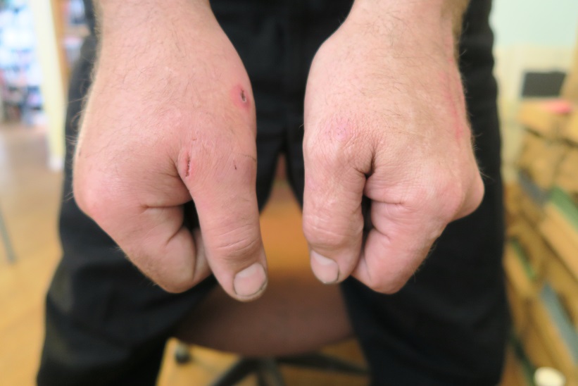 I still had to work, but my strength was reduced, I had a hard time gripping with my right hand. The swelling was pretty bad, my knuckles were slight dimples on my right hand. Here they are side by side.